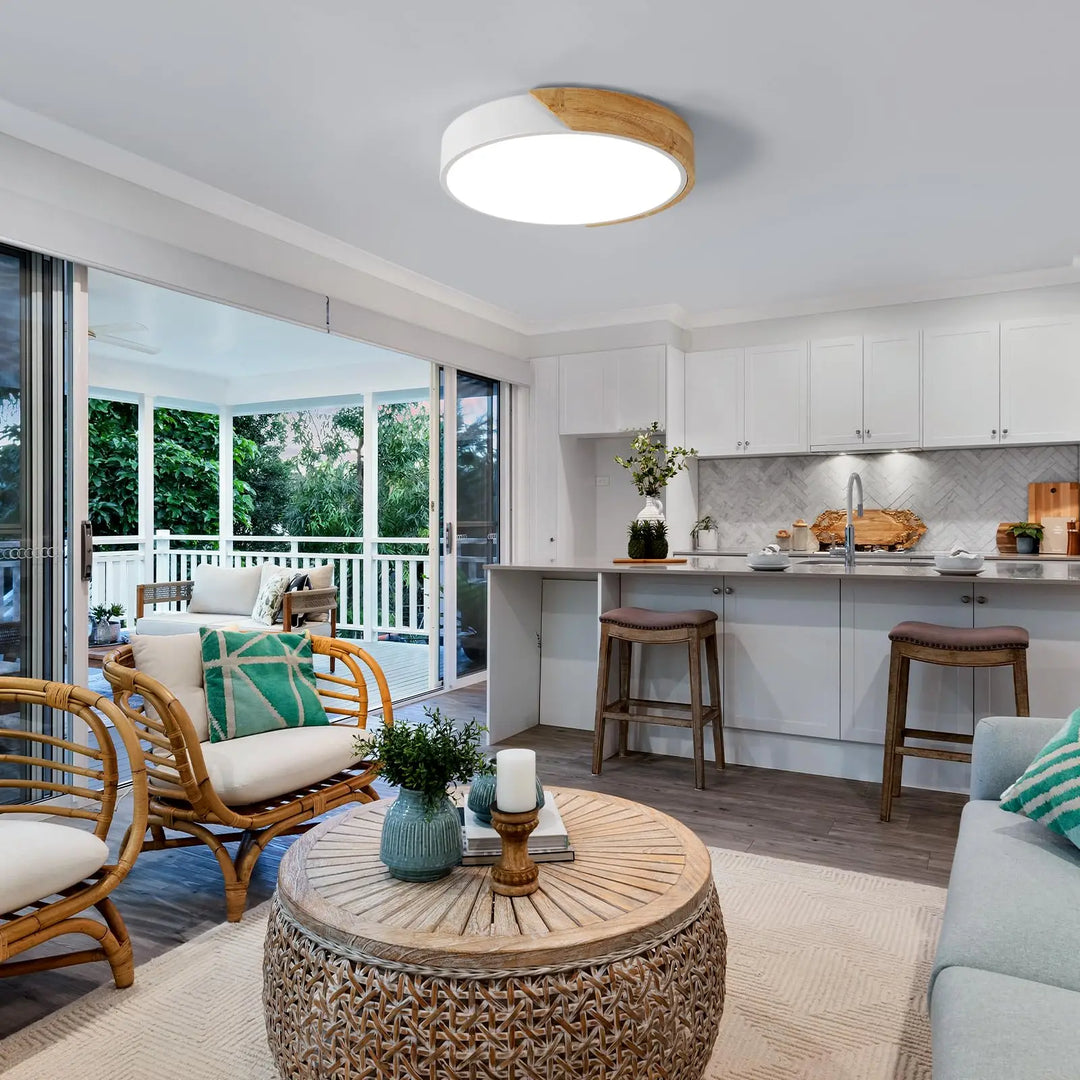 Modern LED ceiling lights, such as those sold by Leroy Merlin, are ideal options for general lighting. These models, often equipped with recessed spotlights, diffuse a uniform light and are available in brass, wood or metal. A kitchen ceiling light can also be an economical and stylish solution for small rooms.