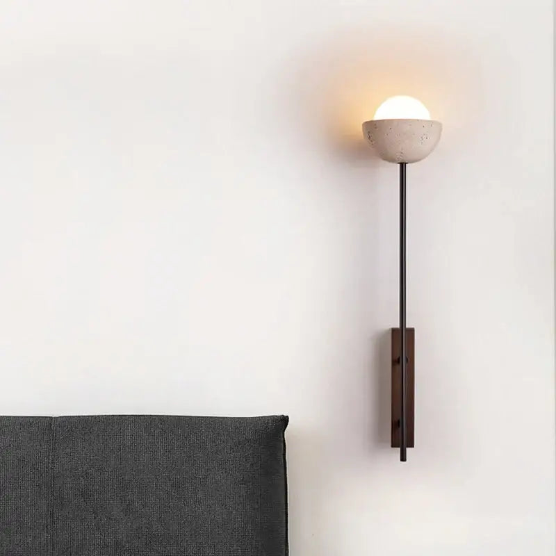 The slender wall sconce with a light stone hemisphere asserts its natural style with simplicity. The light stone hemisphere evokes an organic presence, while the clean structure allows it to interact with modern, Scandinavian, or bohemian decors. This combination of natural shapes and clean lines enhances the wall without visually overloading it, for an elegant and understated result.
