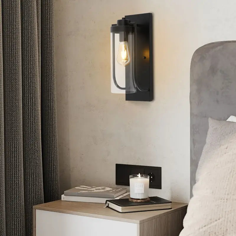 This black, designer outdoor wall light with a cylindrical glass shade does more than just illuminate; it envelops your outdoor space in a warm and inviting atmosphere. The cylindrical glass diffuses a soft light, creating a visual cocoon around walkways, patios, or driveways. This ambiance allows you to fully enjoy evenings outdoors, whether for dinner, relaxation, or a friendly gathering with loved ones. Its subtle glow enhances the feeling of comfort while adding a new dimension to your outdoor spaces, making every moment spent outside more enjoyable.