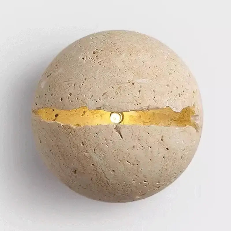 Round split stone wall sconce with gold light enhances the ambiance of an interior with a delicate and warm golden glow.