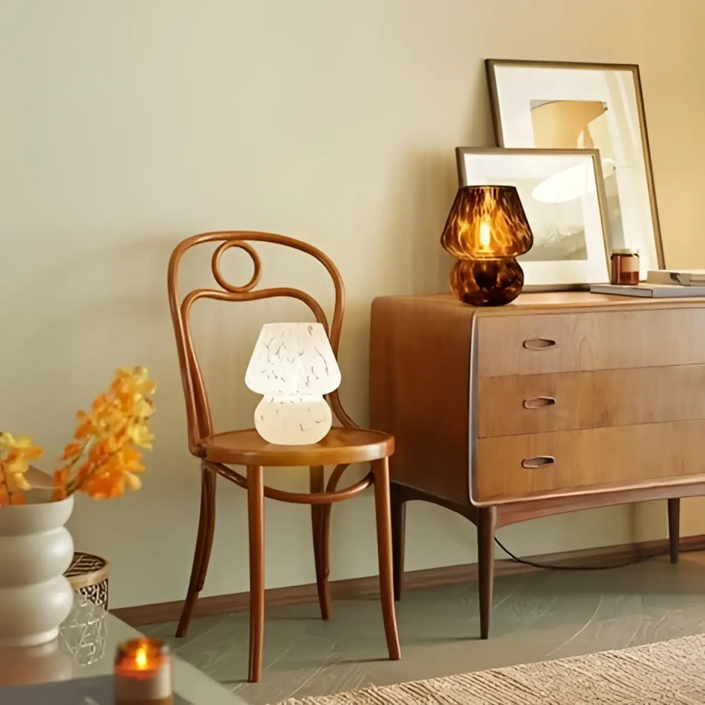 Il n’est pas nécessaire de multiplier les objets pour créer une ambiance raffinée. Parfois, une seule pièce suffit. La lampe champignon vintage et élégante apporte cette touche d’élégance discrète mais efficace.