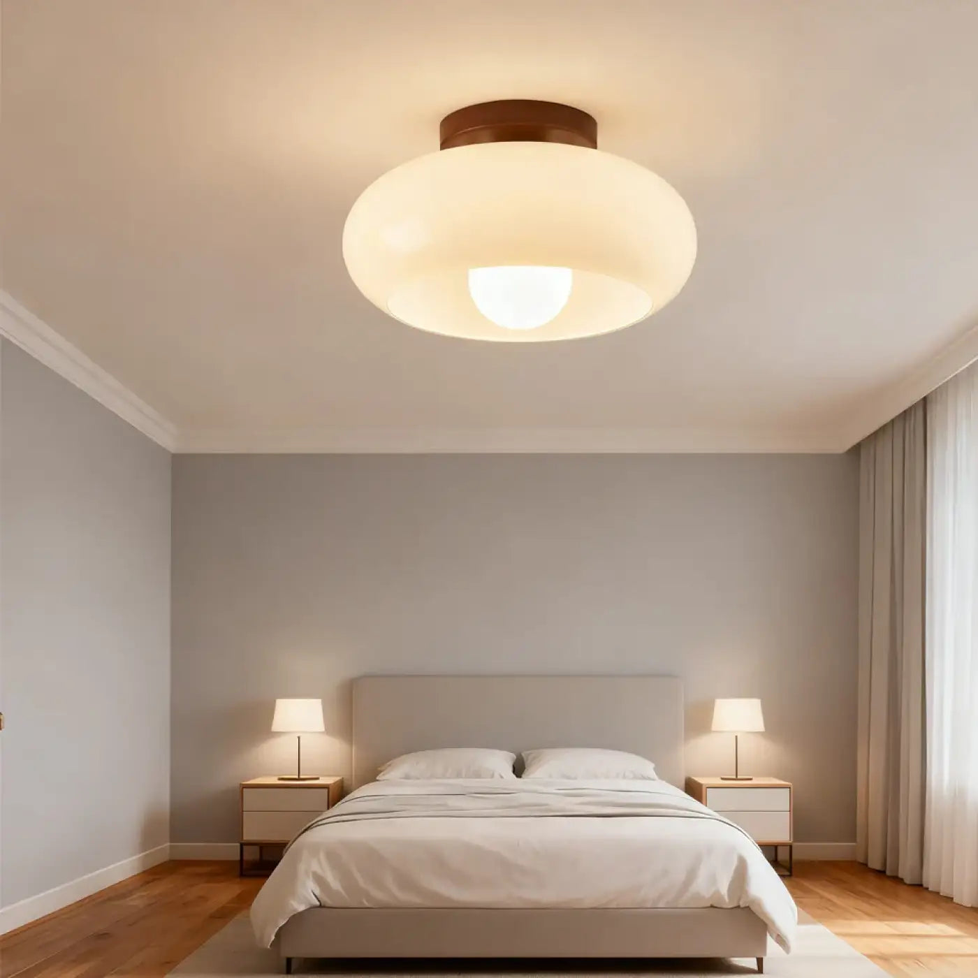 One of the great advantages of a ceiling light made of white glass and natural wood lies in the quality of its light. The white glass, in particular, diffuses a soft and pleasant light, ideal for creating a calming atmosphere. Unlike larger ceiling lights, it doesn't project harsh light, but rather a delicate illumination that enhances your interior décor without glare.