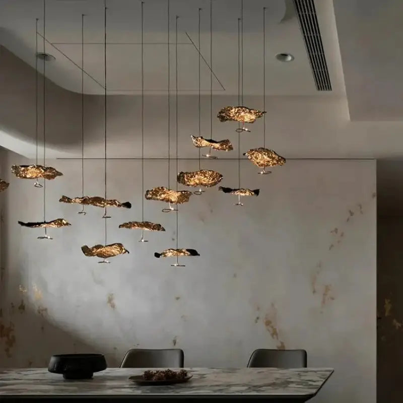 Designing your interior around the Gold Artistic Design Pendant Light with Sculpted Leaf Effect means inviting a striking element that structures the space without overwhelming it: a piece that guides the eye and connects the different elements of your decor. Placed above a dining table, in a living room, or a reception area, it acts as a link between the surrounding textures, colors, and volumes.
