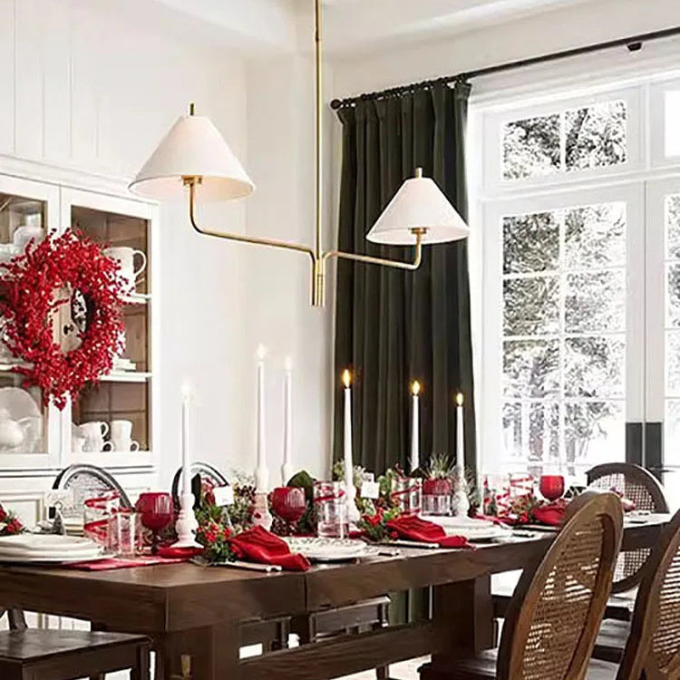 Suspension Design Dorée À Deux Bras Avec Abat Jour Beige : luminaire chic qui transforme votre intérieur en un espace chaleureux et élégant.