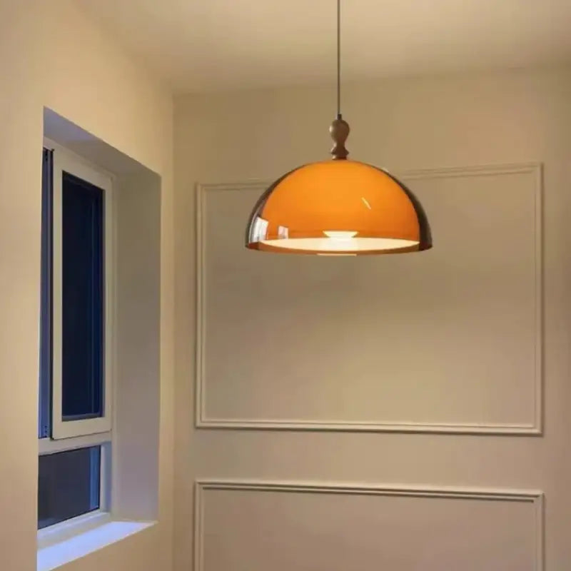 Amber acrylic and wood dome pendant light with a vintage design to create a warm, elegant and timeless atmosphere in your interior.
