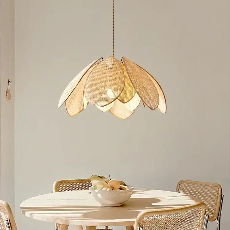 The elegant flower-shaped natural rattan pendant light adapts to a variety of decorative styles. In a bohemian-style home, it pairs perfectly with raw materials, natural fabrics, and earthy colors. In a Scandinavian interior, it adds a warm touch that contrasts with the simplicity of the clean lines.