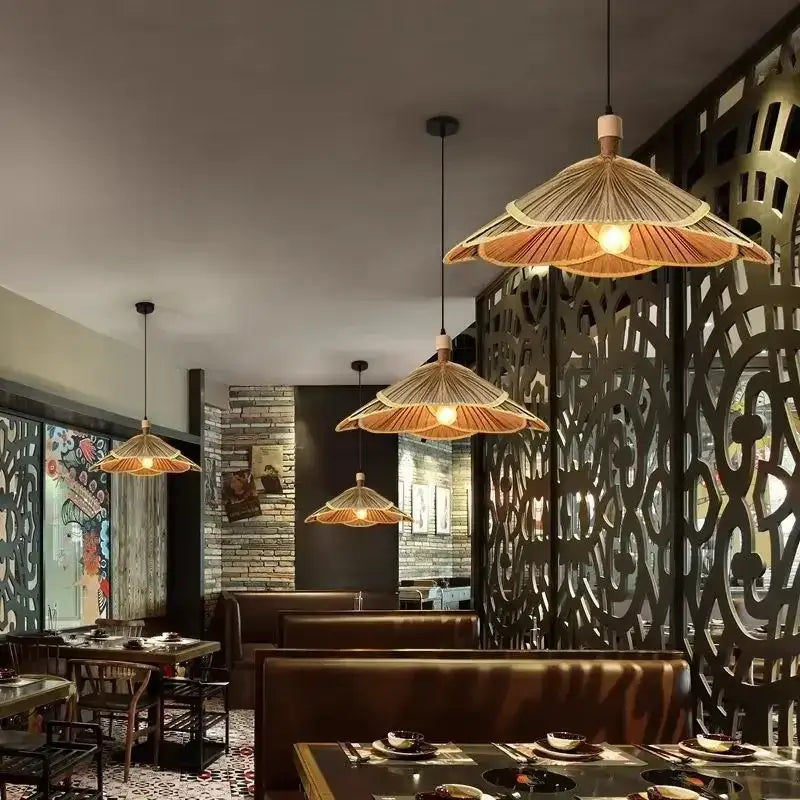 Woven Bamboo Flower Pendant Light for a Natural Ambiance invites you to dive into a world of plant-like softness. Its presence transforms a banal space into a place imbued with discreet charm. Each angle becomes a living tableau of filtered light and organic weaving.