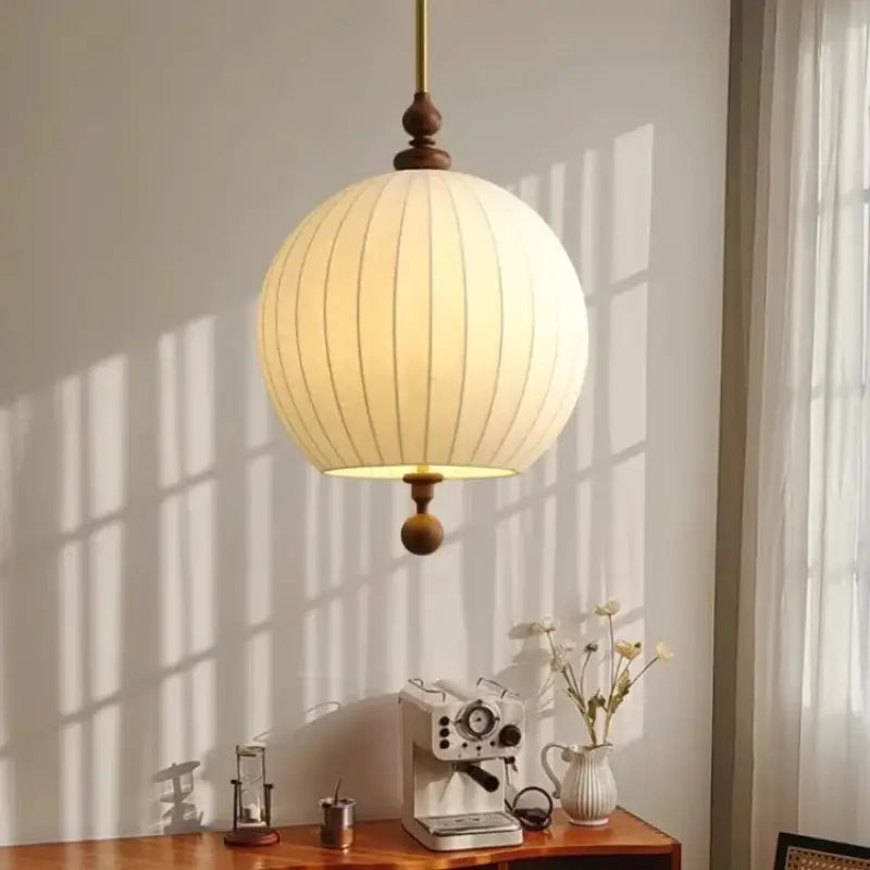 A designer pendant light in fabric and natural wood provides a warm and elegant light that enhances any interior with style and unique conviviality.