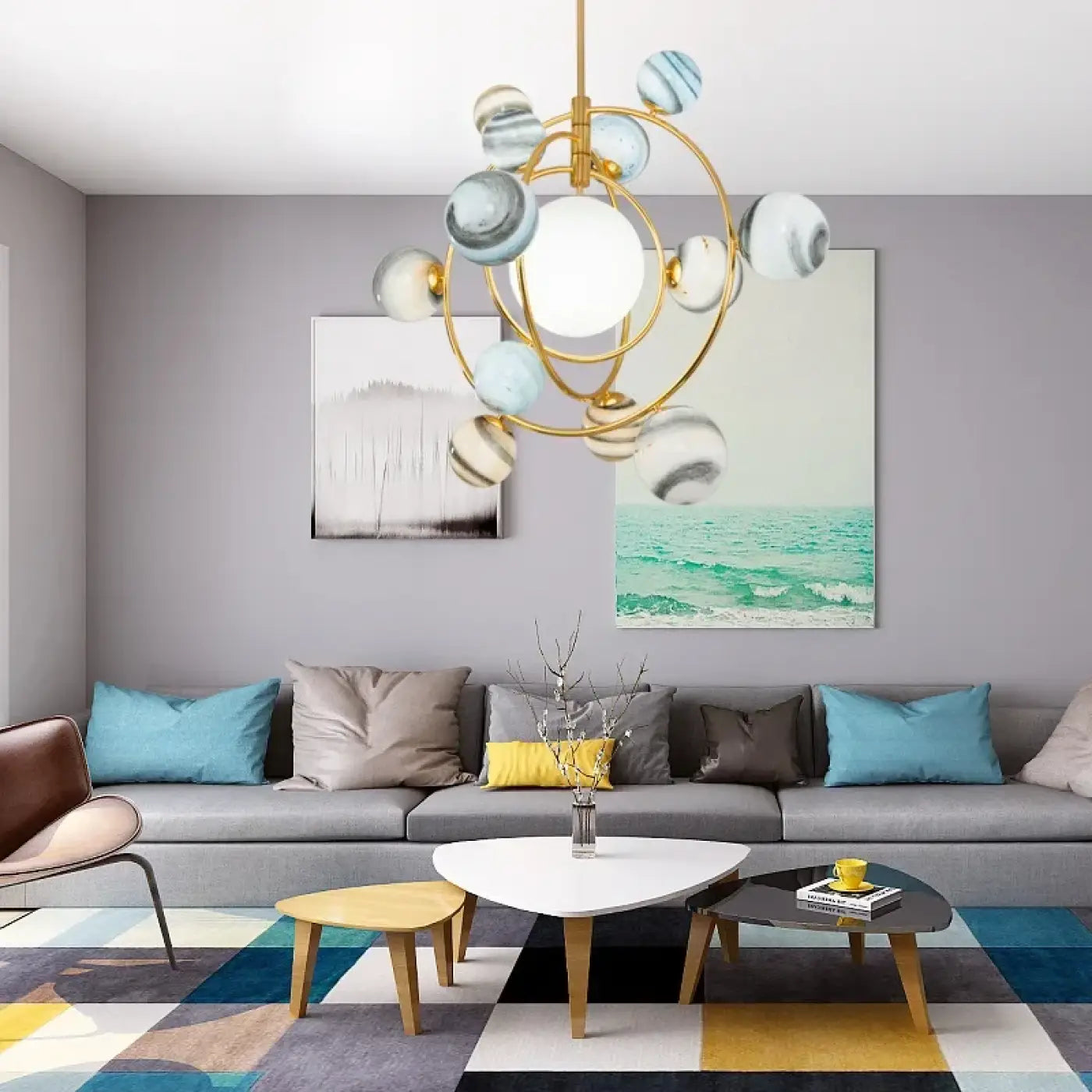 This modern pendant light with marbled glass globes is ideal for a variety of settings. It can be installed above a dining table, in a spacious living room, or even in an entryway for a welcoming, luminous feel. Its ability to complement different furniture and décor styles makes it a perfect choice for modern and contemporary spaces.