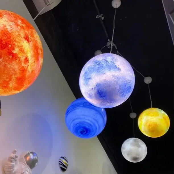 In a well-designed room, the solar system pendant light with planets and clouds quickly becomes a captivating focal point. It draws the eye without monopolizing attention. Placed with its back to the wall or above furniture, it captures ambient light and creates a cozy atmosphere.