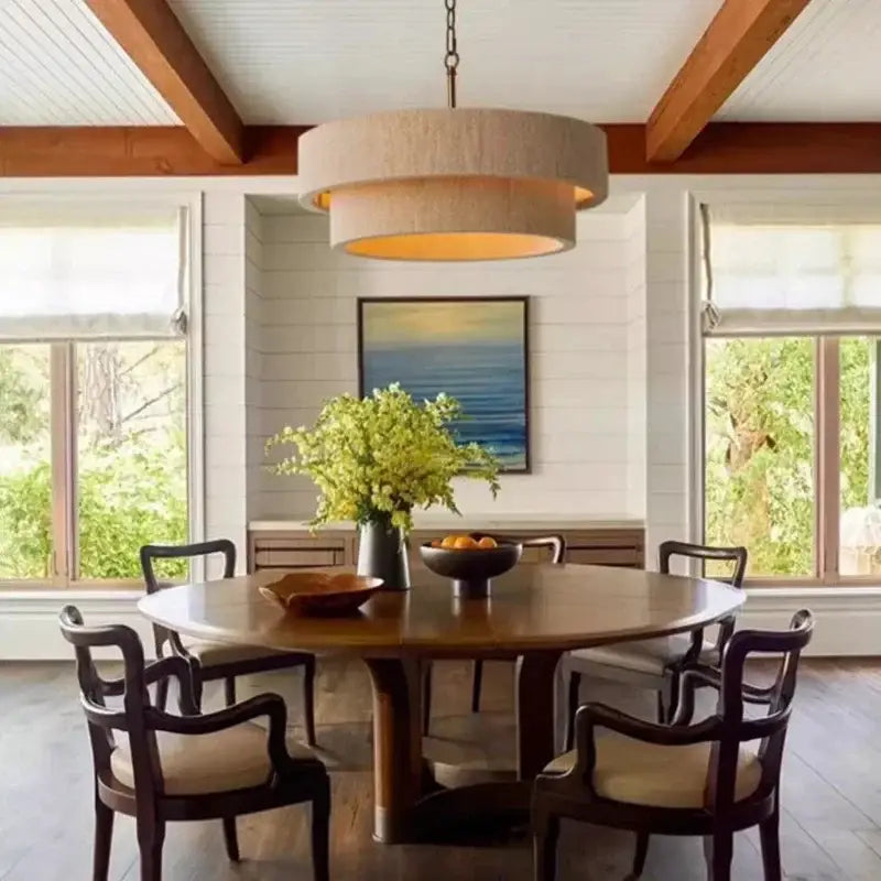 Linen is a noble material that has been prized for centuries for its delicate texture and durability. In this modern beige linen fabric pendant light with double shades, it reveals its full beauty through subtle shades that diffuse a soft, enveloping light. Its beige color is reminiscent of natural, earthy tones, perfect for creating a soothing atmosphere.