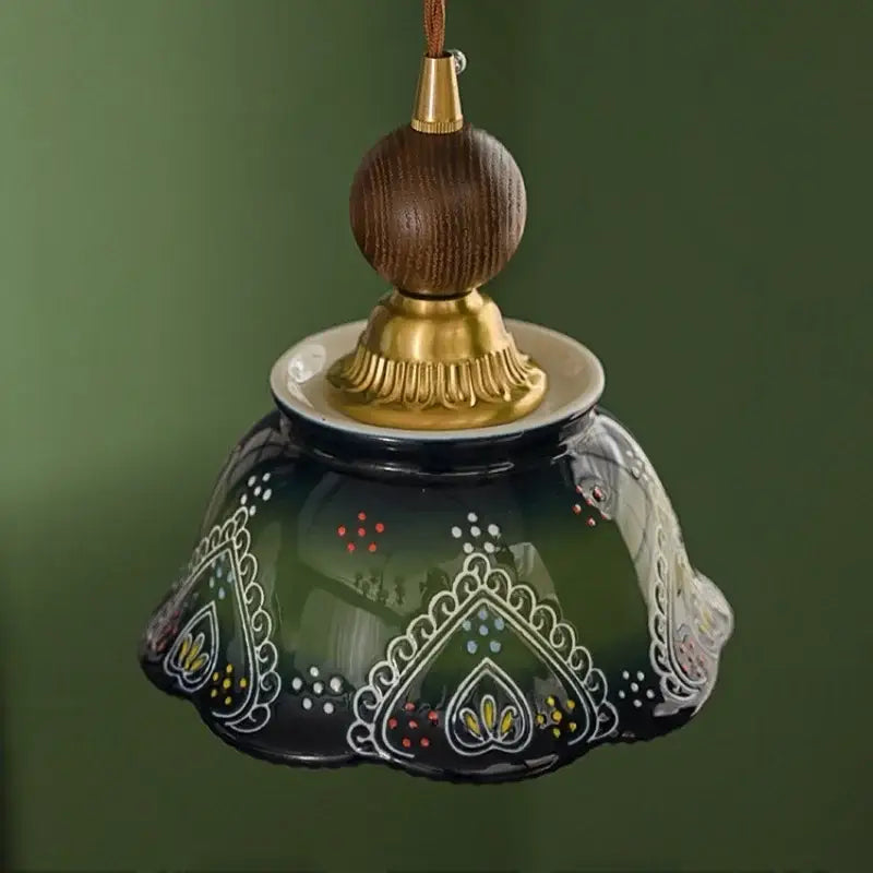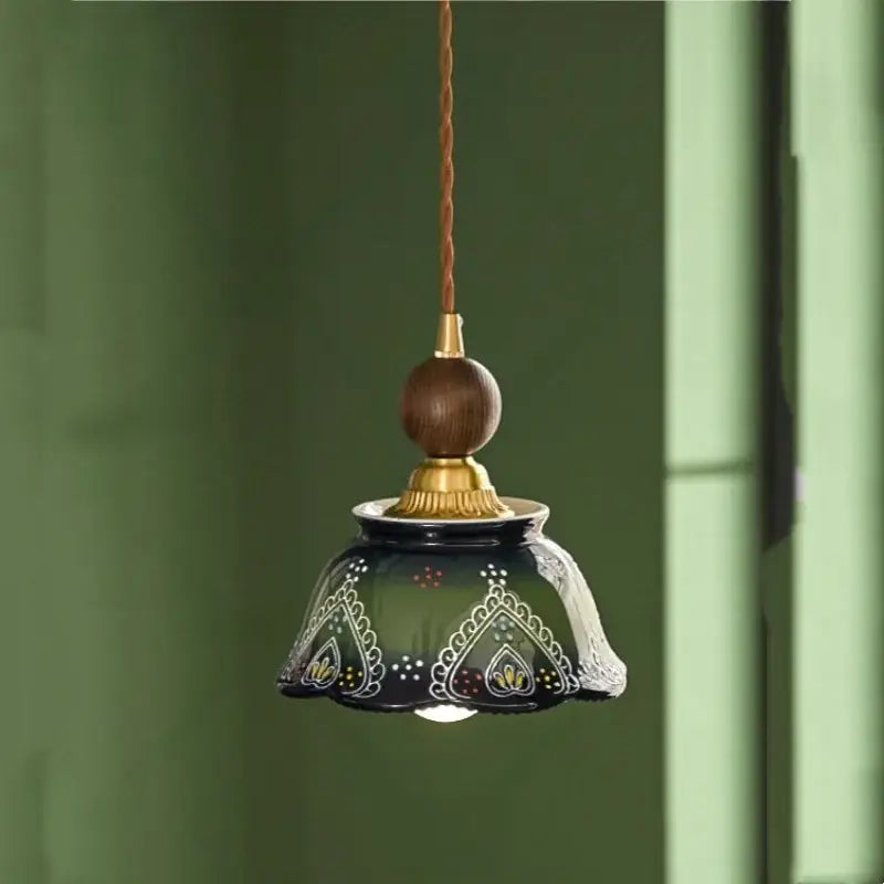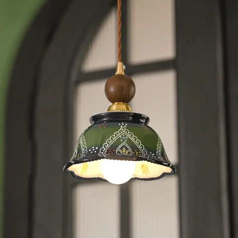 Vintage green ceramic and wood pendant light for living room: a retro light combining ceramic and wood, bringing warmth, elegance and soft lighting to your interior.