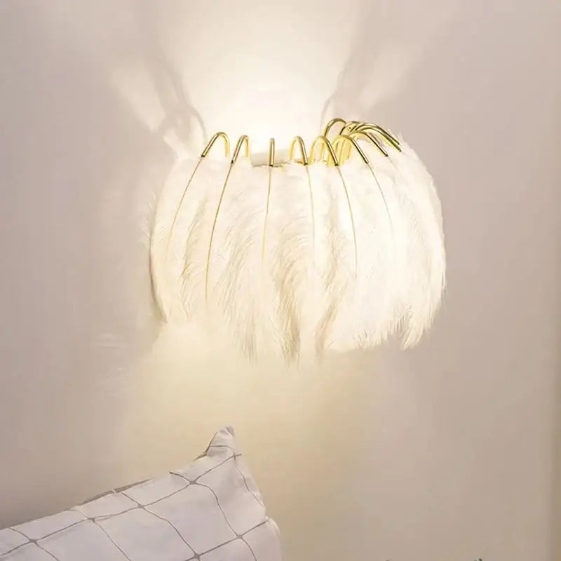 White feather wall light with gold support: a refined light fixture that combines the softness of white feathers with the brilliance of the gold support