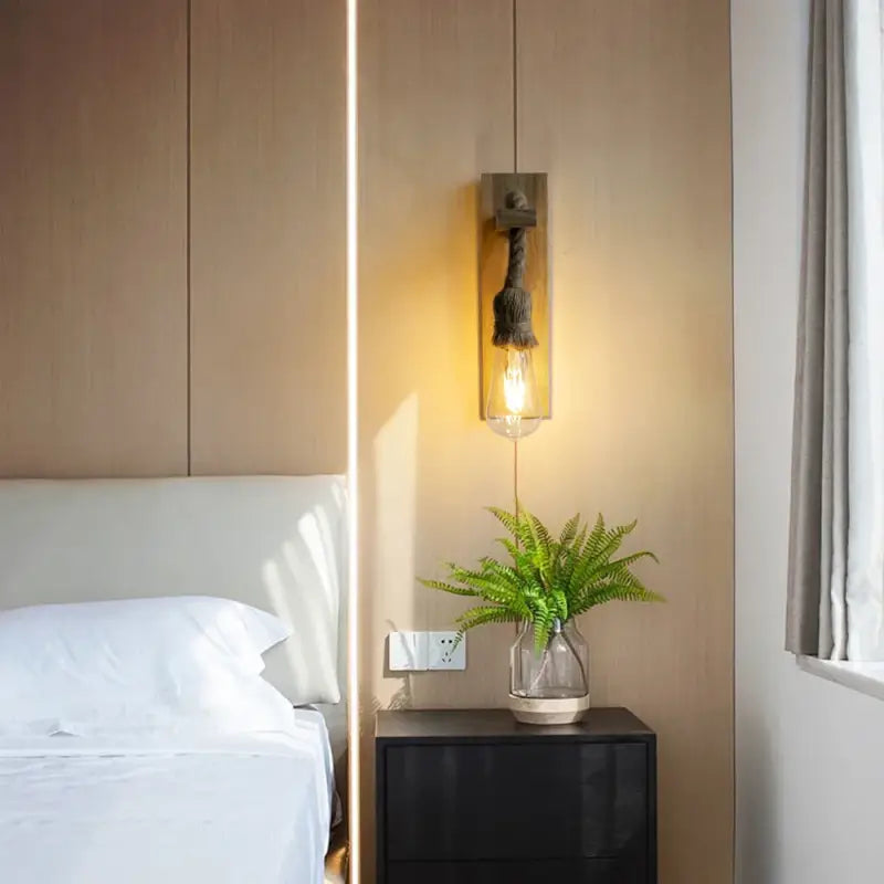The design of this wall sconce allows for a soft, subdued light diffusion. The wood and rope filter the light, creating a soothing and relaxing ambiance. This type of lighting is ideal for relaxing moments, evening reading, or family dinners. It helps create a serene and welcoming atmosphere in your living space.